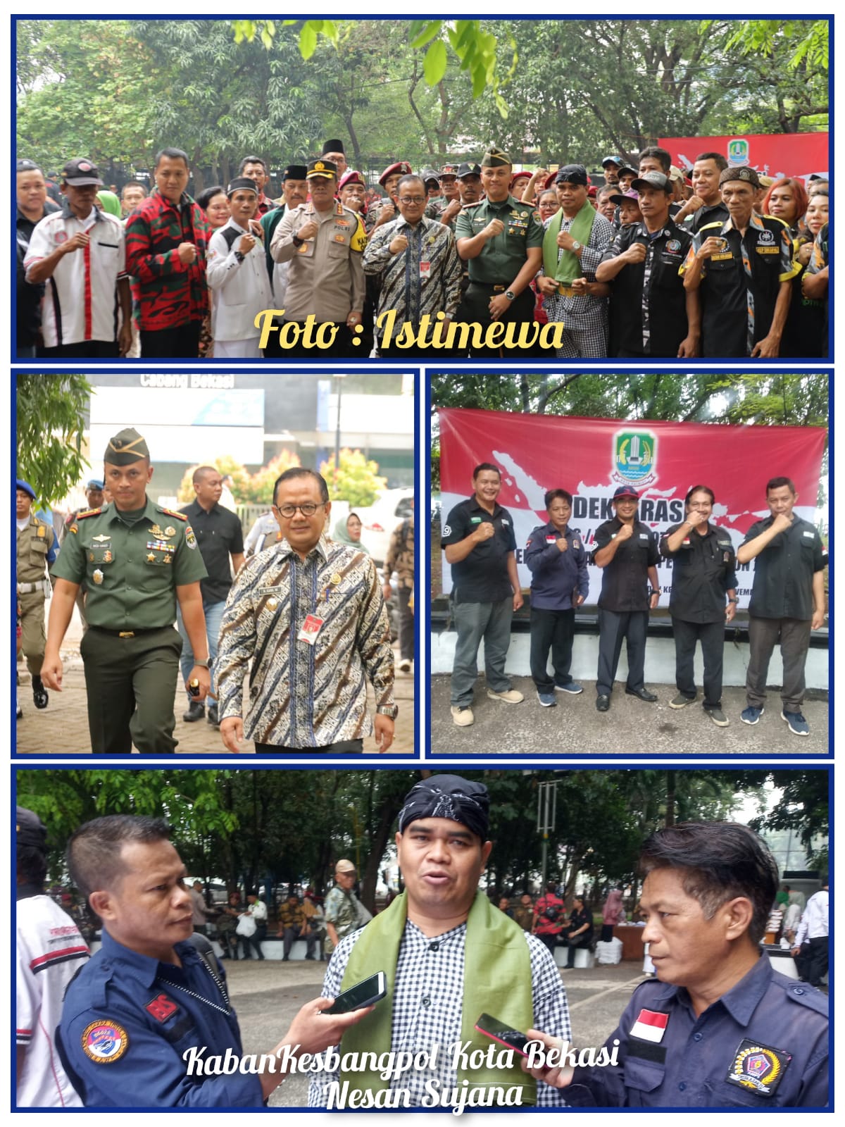 Seusai upacara deklarasi damai. Kepala Kesbangpol Kota Bekasi. Nesan Sujana saat ditemui di lapangan Mengatakan, bahwa kami mengajak seluruh komponen organisasi masyarakat maupun masyarakat, agar dapat menjaga kondusifitas di Kota Bekasi pada saat pesta demokrasi diselenggarakan nanti, sesuai ikrar yang ditangani bersama yang berbunyi: