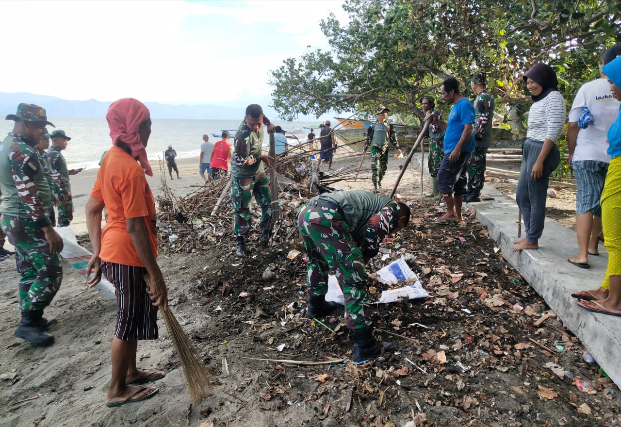 Malut- Koramil 1508-03/Kao Kabupaten Halmahera Utara, Maluku Utara, bersama jajaran Pemerintah Desa (Pemdes) dan warga melaksanakan kegiatan bakti pembersihan pantai di Desa Kao Kecamatan Kao, pada Kamis (11/1).