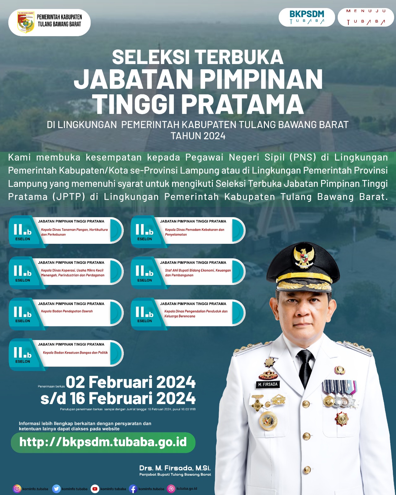 PANARAGAN- Penjabat (Pj) Bupati Tulangbawang Barat (Tubaba) Drs. M. Firsada, M.Si. menyatakan Pemerintah Kabupaten (Pemkab) Tubaba telah membuka pengumuman seleksi terbuka pengisian 7 (tujuh) Kepala Organisasi Perangkat Daerah (OPD) atau Jabatan Pimpinan Tinggi Pratama (JPTP) yang dimulai 2-16 Februari 2024.