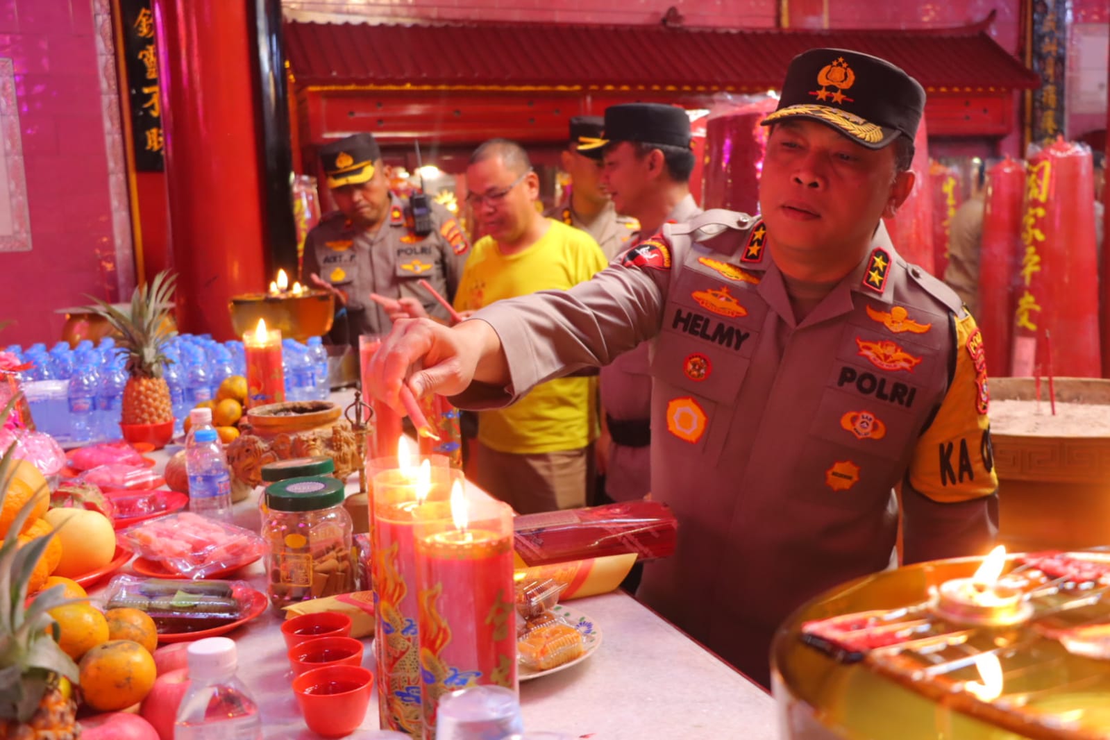 LAMPUNG — Kapolda Lampung Inspektur Jenderal (Irjen) Helmy Santika meninjau pengamanan malam Imlek di sejumlah vihara di Bandar Lampung.