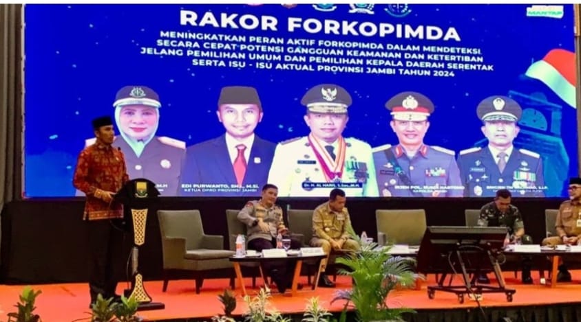 Jambi – Ketua DPRD Provinsi Jambi, Edi Purwanto menjadi pembicara di rapat koordinasi untuk meningkatkan peran aktif forkompimda dalam mendeteksi secara cepat potensi gangguan keamanan dan ketertiban masyarakat (kamtibmad) jelang pemilihan umum (pemilu) dan pemilihan kepala daerah (Pilkada) serentak serta isu-isu aktual Provinsi Jambi tahun 2024, Senin (12/2/2024).