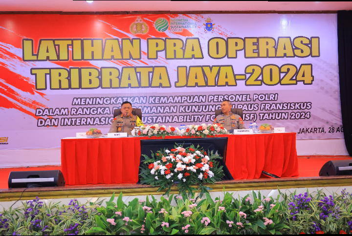 Independenpos.co , Jakarta-Polri menggelar latihan pra Operasi Tribrata Jaya 2024 dalam rangka pengamanan kunjungan Paus Fransiskus dan Internasional Sustainability Forum (ISF) tahun 2024. Latihan ini digelar di Balai Pertemuan Polda Metro Jaya, Rabu (28/8/2024).