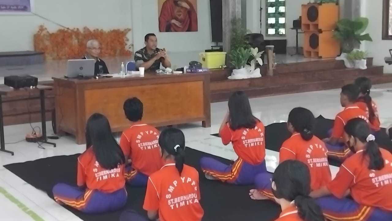 Independenpos.co , Timika – Babinsa Koramil 03/Kuala Kencana Kodim 1710/Mimika, Serma Safi’i dan Serka Juventino Siregar melaksanakan Komsos dan memberikan pelatihan Peraturan Baris Berbaris (PBB) kepada murid sekolah di SMP YPPK St. Bernadus Sp3, Distrik Kuala Kencana, Kab. Mimika. Jumat (30/8/2024).