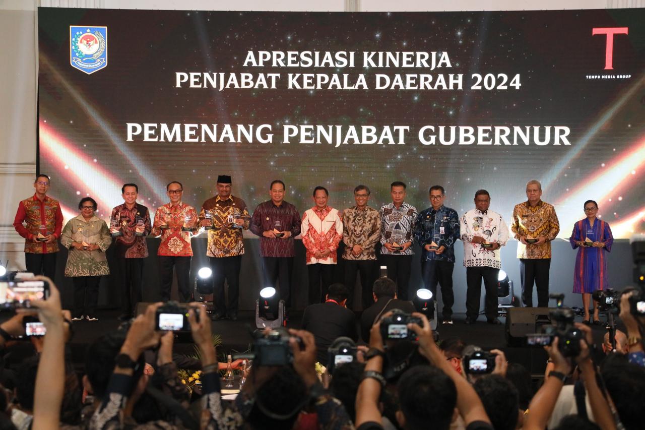 Jakarta – Kementerian Dalam Negeri (Kemendagri) berkolaborasi dengan Tempo Media Group memberikan penghargaan kepada penjabat (Pj.) kepala daerah yang berkinerja baik. Penghargaan itu diberikan melalui gelaran “Apresiasi Kinerja Penjabat Kepala Daerah 2024” di The Tribrata Hotel Convention Center, Jakarta, Jumat (30/8/2024).