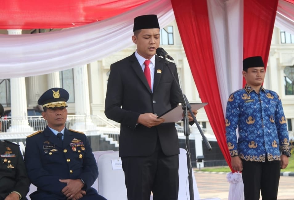 Jambi – Ketua DPRD Provinsi Jambi M.Hafis Fatah membacakan Ikrar Pancasila Penjabat Sementara (Pjs) Gubernur Jambi Dr. H. Sudirman, SH., MH, menjadi Inspektur Upacara Peringatan Hari Kesaktian Pancasila 1 Oktober 2024, bertempat di Lapangan Kantor Gubernur Jambi, Selasa (01/10/2024) pagi.