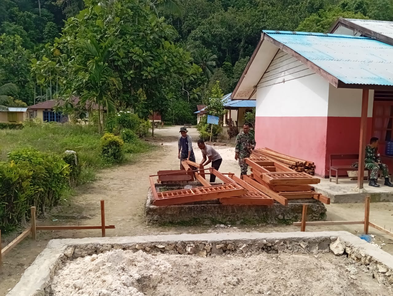 Semangat kerja personel satgas tak pernah kendor sedikitpun meski medan sulit dan penuh tantangan, hanya satu tujuan yang ingin dicapai, pekerjaan pembangunan Rumah Tidak Layak Huni (RTLH) dan sasaran lain dalam TMMD Reguler di Kampung Saporkren selesai tepat waktu dengan hasil maksimal atau selesai seratus persen.