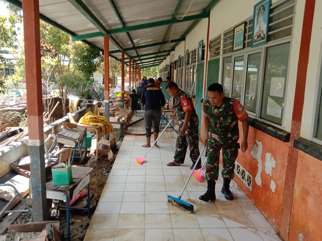 Sekolah yang terdampak banjir mengalami kerusakan pada ruang kelas, halaman, dan fasilitas lainnya akibat lumpur dan sampah yang terbawa air. Bersama Persatuan Guru Republik Indonesia (PGRI) Trumon Raya, BPBD serta warga setempat, para anggota TNI yang bertugas sebagai Babinsa itu membersihkan sisa-sisa lumpur, memperbaiki meja dan kursi, serta memastikan lingkungan sekolah kembali layak digunakan oleh siswa.