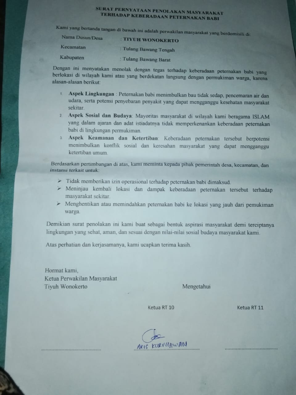 Bangunan B2 dapat membawa dampak buruk bagi lingkungan dan kesehatan, warga Wonokerto Tandatangani Surat Penolakan