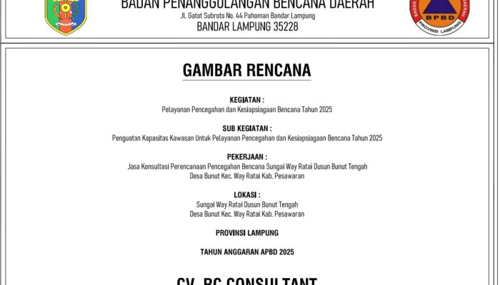 Proyek dengan nilai kontrak Rp2.683.367.900 itu dikerjakan oleh CV. Adi Jaya Lampung Konstruksi di bawah tanggung jawab BPBD Provinsi Lampung. Namun, menurut hasil penelusuran lapangan FOKAL, pelaksanaan proyek jauh dari spesifikasi teknis sebagaimana tercantum dalam gambar kerja dan RAB.