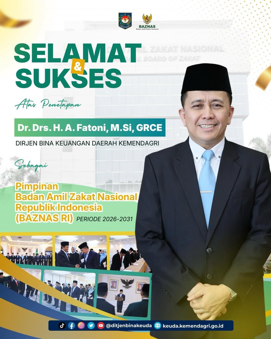 JAKARTA – Presiden Republik Indonesia Prabowo Subianto menetapkan dan menunjuk Agus Fatoni Direktur Jenderal Bina Keuangan Daerah Kementerian Dalam Negeri sebagai Anggota Badan Amil Zakat Nasional (BAZNAS) masa bakti 2026–2031.